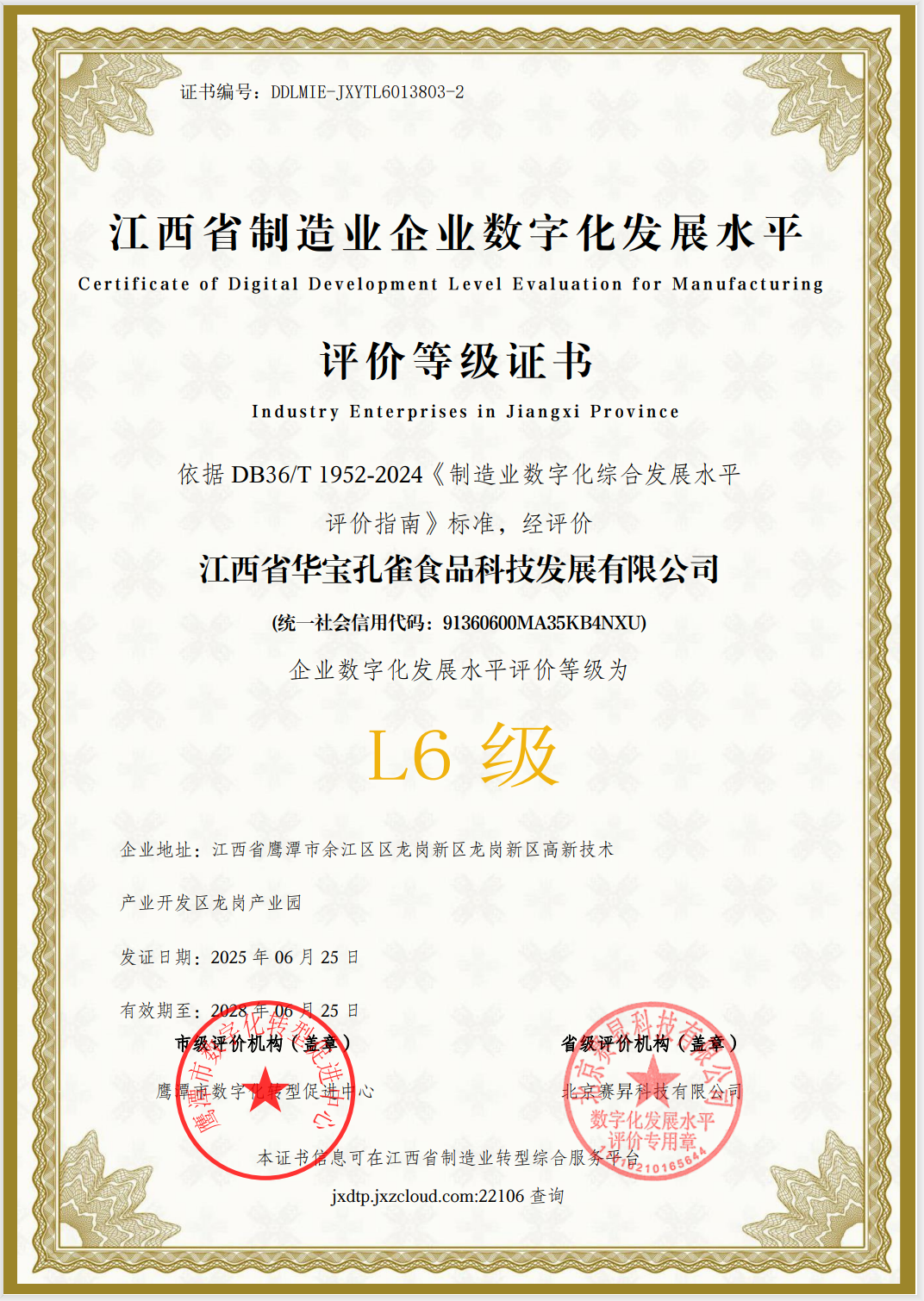 江西孔雀榮膺“江西省制造業(yè)數字化發(fā)展水平L6級認證”
